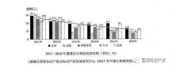 B. 2015年企业和高校遭遇侵权的比例较之以往四年有所提高,总体侵权比例也略有反弹:而2016年各项侵权比例均呈下降态势,总体遭遇侵权比例为10.7%。